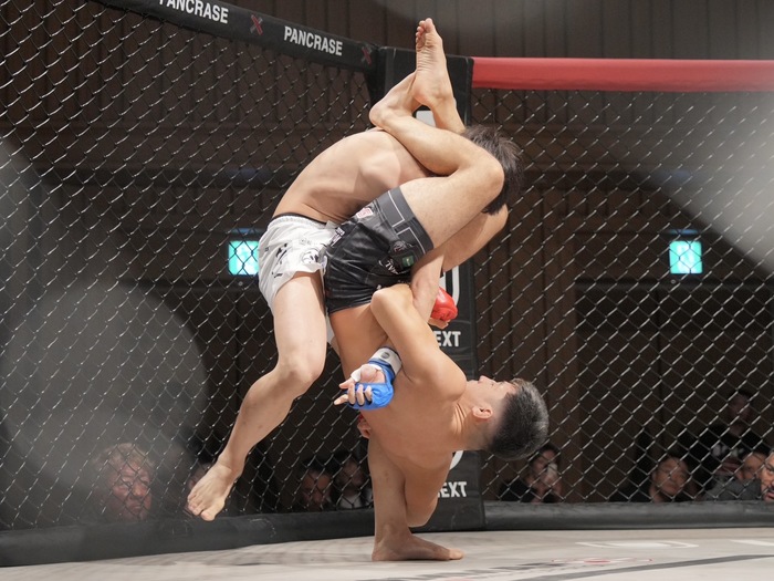 1R、ともにオーソドックス構え。ナカガワは先に右カーフ。沢木は左ジャブ、ワンツーの右を当てる。ナカガワは左前手フックからダブルレッグテイクダウンから一気にギロチンチョーク。さらに左オーバーフックから三角絞め、バックでボディトライアングル。足を解いて腕十字へ。上体を起こす沢木に下から足関節も沢木は足を抜いて両者立ち上がり。