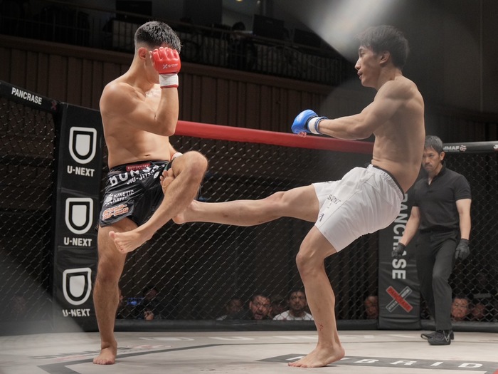 左ジャブの沢木に右ローのナカガワ。ジャブの刺し合いは沢木。ナカガワのシングルレッグを切る。沢木のジャブを被弾したナカガワ。さらに右カーフも。頭が動かないナカガワを狙い打ちする沢木。さらに左ミドルに繋ぐ。