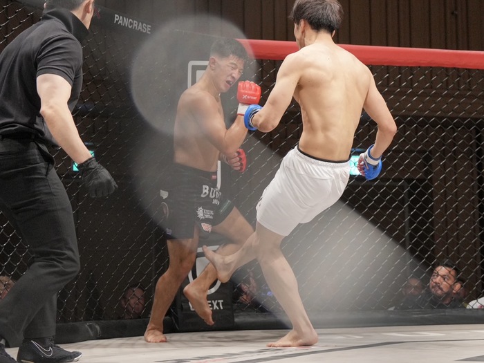 2R、左ジャブから入る沢木。ワンツーの右を届かせる。左ハイから組んだナカガワ。四つからクローズドに引き込み。下からボディトライアングルで細かいパンチ、ヒジのナカガワ。室伏兄弟の目前で上体を立ててパウンドを狙う沢木は体を離して蹴り。ブレークに。