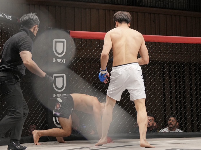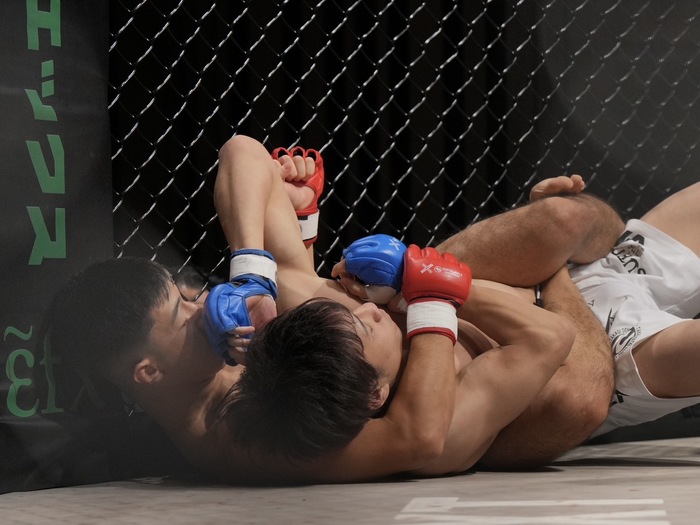 右カーフを当てる沢木。ナカカガワはダブルレッグから一気にマウント、腕十字! ヒジが伸びかけるが前転、またいで後ろ向きになって外した沢木。パウンドから立ち上がり、スタンドで右カーフ! 足が流れたナカガワ。さらに右カーフで倒れ、レフェリーが間に入った。