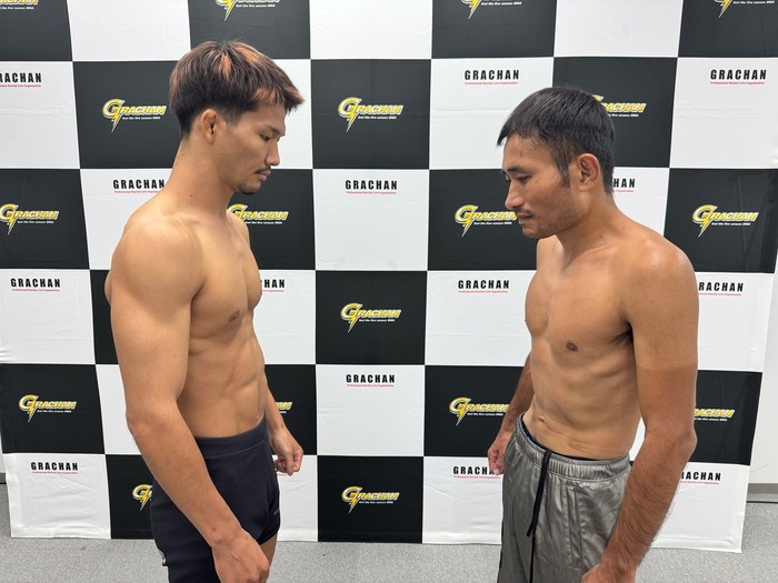 1R、ともにサウスポー構え。右カーフを当てる三澤。二ノ宮の左に右をかぶせる三澤は打ち終わりに組んでテイクダウン。