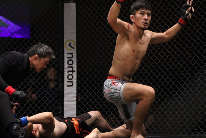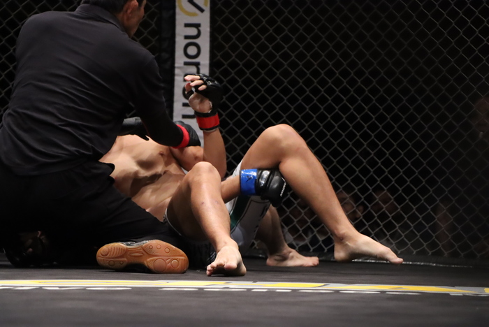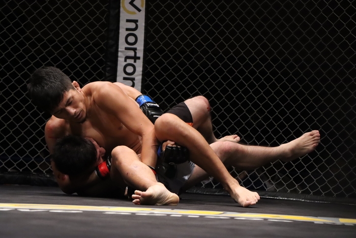 1R、大村はダブルアンダーフックから投げて足関節に。潰してパウンドの牧瀬に、立つ大村。牧瀬は首投げから袈裟、Vクロスで両足で腕を極めた。