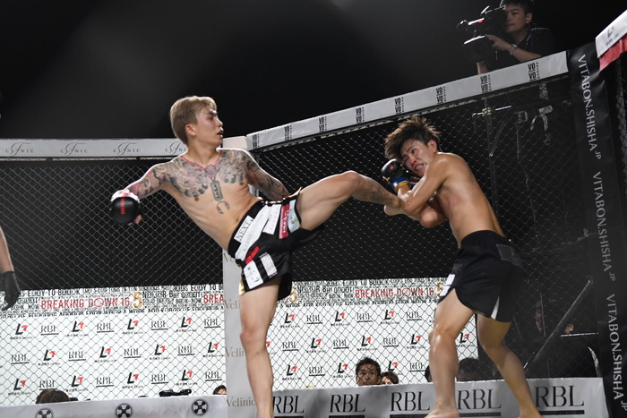 開始と同時に打ち合う両者、右でヒットを奪うのは修羅斗だが、ローキックがローブローに。龍志にインターバルが与えられる。修羅斗は右カーフから右ミドル、蹴りを多用するが右ミドルをキャッチされる。龍志は蹴り足を持ったままの右ハイでダウンを奪う。逆転を狙って前に出る修羅斗だが龍志の右フックでふらつき、最後の右ハイはブロックされた。