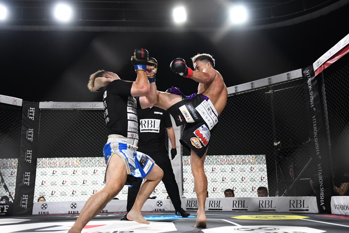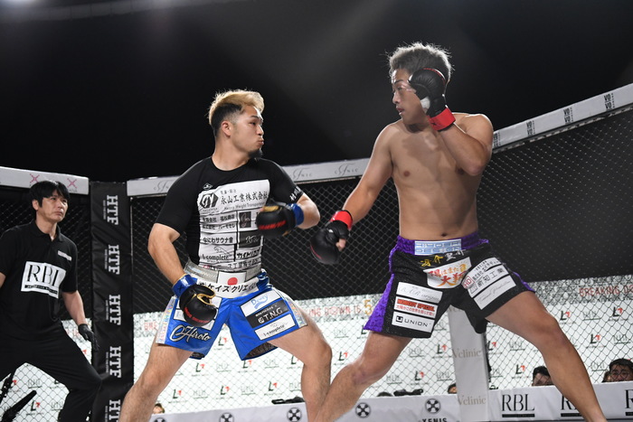両者近い距離で蹴りからパンチ。HIROTOはスピードのある左右フック。水口は左ストレート、左フック。HIROTOが前へ出て左右フック。水口も強打を出すが、HIROTOのフックが的確だ。最後にHIROTOが左フックでダウンを奪ったが、ゴングが鳴った後だったということでノーカウントに。
