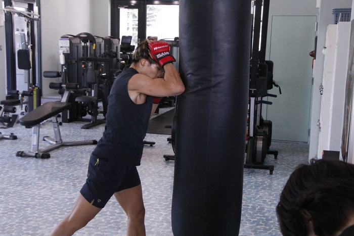 軍司はシャドーとサンドバッグ打ちを行い、いずれでもパンチからヒジ、ヒザにつなげるコンビネーションを披露。ヒジへのつなぎも流れるようで、REDルールにさらに適応していることを伺わせた。