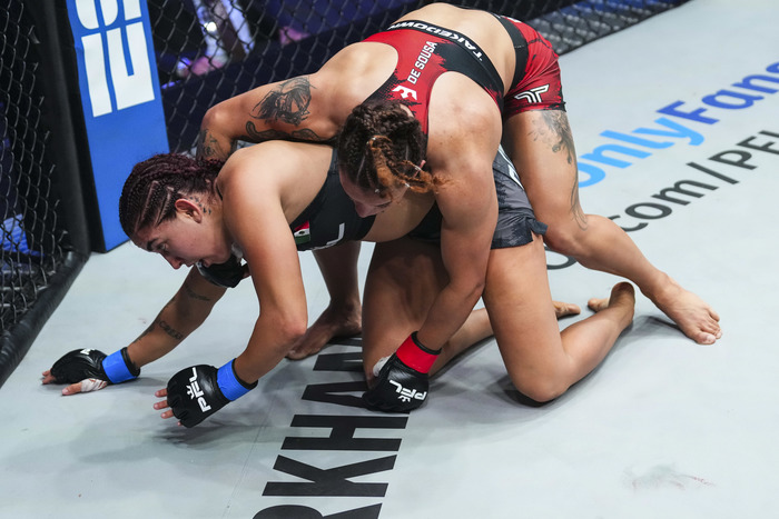 女子フライ級のサブリナ・ソウザ(バーレーン/ブラジル)は、IMMAF世界選手権3連覇、アマ15連勝でプロMMA2連勝中。現修斗ブラジル女子フライ王者。対するオスコスは、2019年にRIIZNに参戦し、村田夏南子にヴォンフルーチョークで一本負け、PFLではスミコ・イナバ、イララ・ジョアニに判定負け。MMA8勝7敗。試合は判定3-0(30-27×3)のフルマークでソウザが打撃でも組みでもドミネートして勝利。キャリア初の判定勝ちながら、MMA4勝無敗とした。