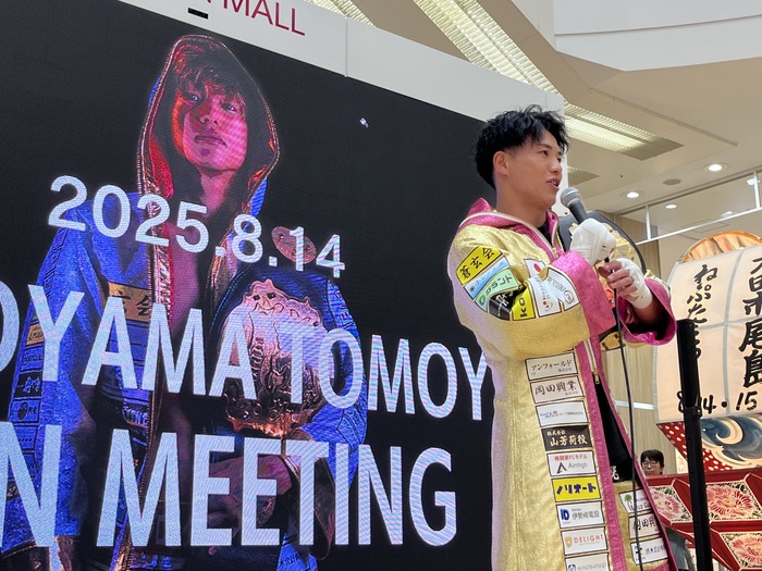 2025年8月14日(木)群馬・イオンモール太田にて行われたスペシャルイベントに出席したKrushスーパー・フェザー級王者の横山朋哉(リーブルロア)。