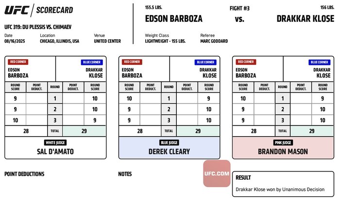 #UFC319 Official Result: Drakkar Klose (29-28, 29-28, 29-28 | @DrakkarKlose) defeats Edson Barboza via Unanimous Decision.