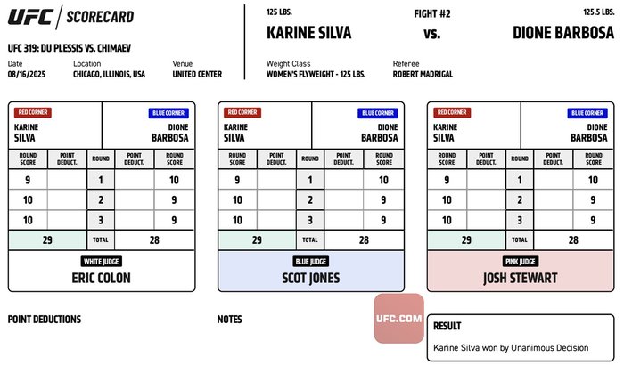 #UFC319 Official Result: Karine Silva (29-28, 29-28, 29-28 | @KillerKarine) defeats Dione Barbosa via Unanimous Decision.