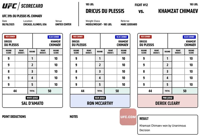 試合後、チマエフは「最後の1分で、あの男(デュ・プレシ)が仕留めようとしてきた。フィニュシュできなくてすまない、みんな。でも満足だ。お金をもらわないと、ダナ、送金してくれ。“シット”ベルトよりも。私の国にとってはベルトは重要だけど。