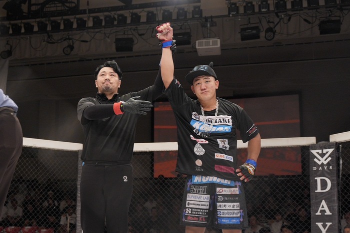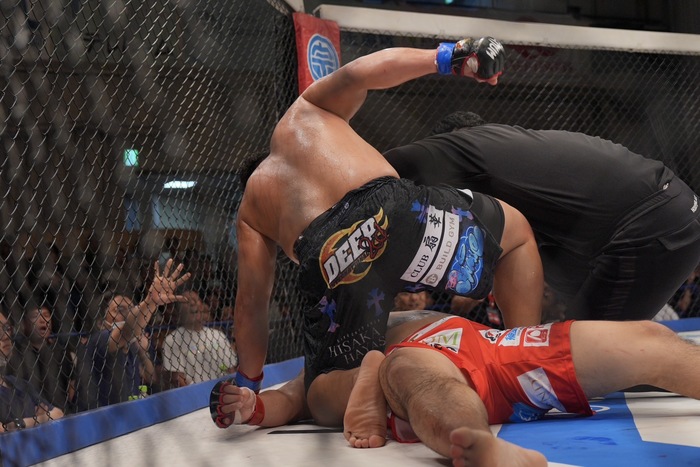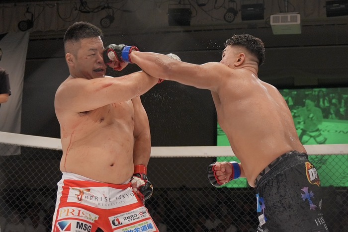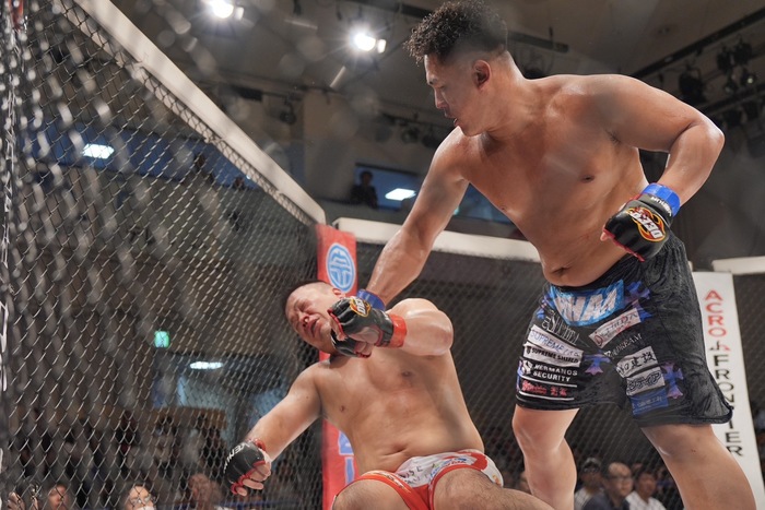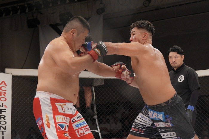 左前蹴りの大成。バックフィストをかわした酒井。そのまま組んだ大成を突き放した酒井だが、大成はじりじりと詰めると右手で酒井の左手を払ってショートの左ストレート! ダウンした酒井の立ち上がりにサッカーキック2発! パウンド1発でレフェリーが間に入った。