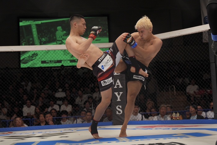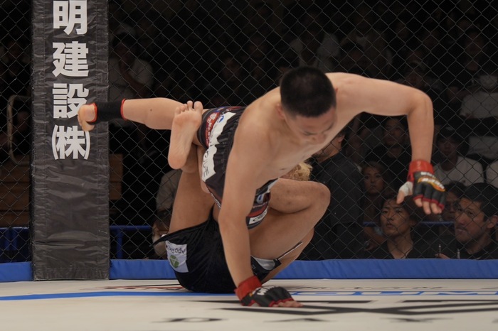 そのまま引き込み下になる佐々木に神田は離れてサッカーキック! 立つ佐々木の右に左テンカオを合わせる神田は、引き込む佐々木を切って蹴り、足をさばいてゴング。