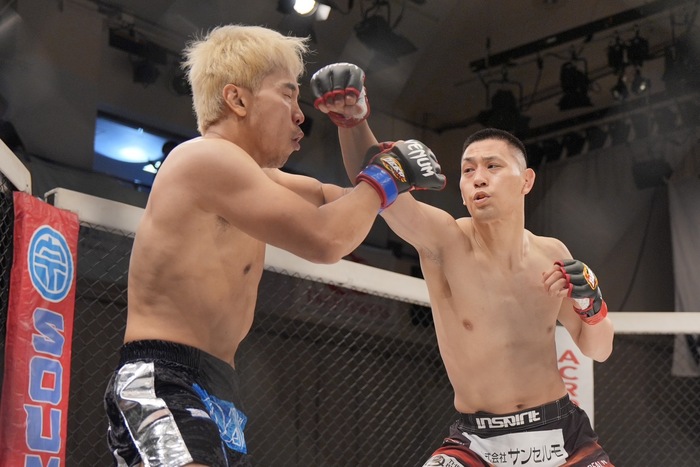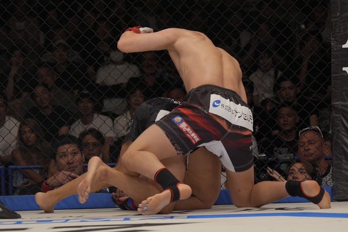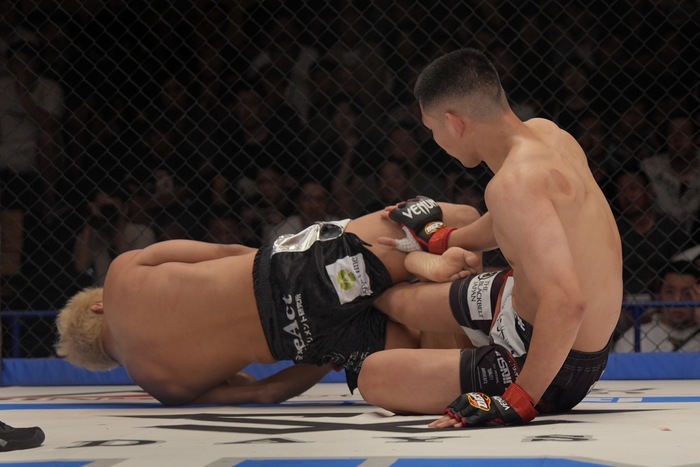 2R、半身の佐々木に右を突いて詰める神田。佐々木はカニ挟みから足関節を狙うが、ヒザは抜けている神田、足を抜いてパウンド連打に佐々木は動けず、レフェリーが間に入った。