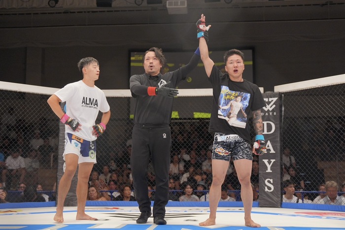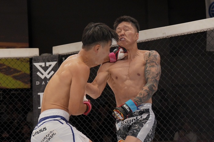 ノーモーションの右を首もとに突く松岡に、原はダブルレッグでケージまで押し込むが、松岡のヒザ蹴りがローブローに。再開。組みから再開。脇潜りボディロックで崩してバッククリンチの原は、背後から細かいヒザ、松岡も右ミドルはまだ浅い。しかし、右から左をヒット! 腰を落とした原だが詰め切れずゴング。