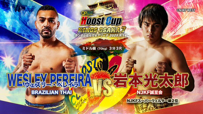 岩本は、デビュー時のライト級から階級をあげて躍進し、今年3月のNJKF WESTではNJKFトップランカーでHOOST CUPでも活躍の龍威地に勝利し、NJKFトップランキングに躍り出た。対するペレイラは、4冠王ダニロ・ザノリニ率いるブラジリアンタイの激闘ファイターで、HOOST CUPでも度々倒し倒されの激闘を繰り広げている。軽重量級の激しい試合が期待される。