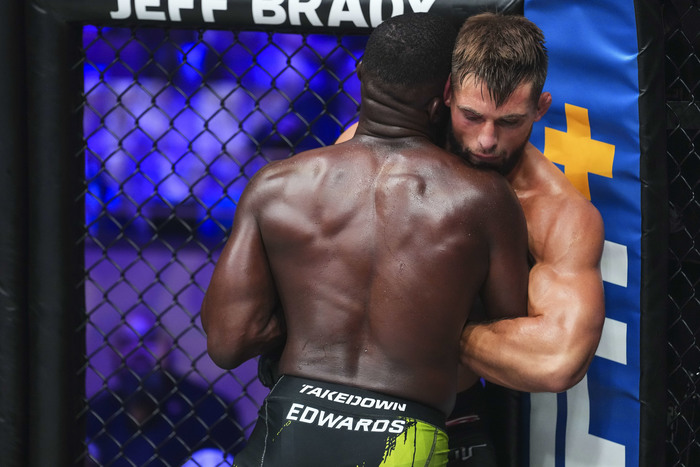 右で差し込むロスタはボディロックで持ち上げ、中央に運んでテイクダウン! 残り1分。左で枕もバタフライガードから立ち上がるエドワーズ! ロスタは右からで詰めて右ハイも、エドワーズも左を返すと、ロスタは詰めて押し込みゴング。