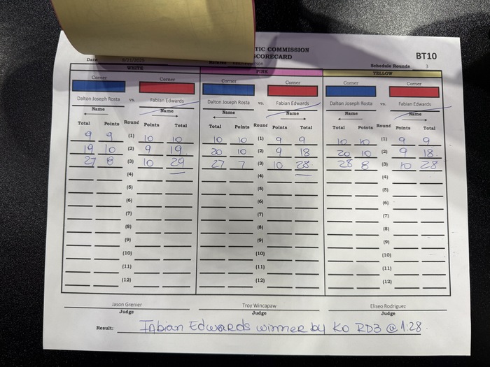 3R、左前蹴りのエドワーズ。左関節蹴りのロスタ。エドワーズの右カーフはチェックする。詰めるエドワーズは押し込み左ヒジ。ロスタは右ボディストレート。しかし、向き合って詰めたエドワーズは左ハイ! 上中下と散らされてガードが下がったロスタは被弾し、後方に倒れ、そこにエドワーズはパウンド1発、KO勝ち!