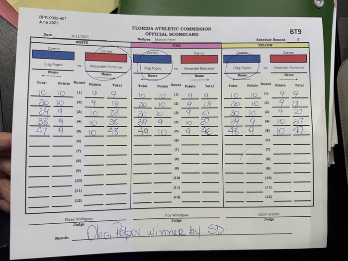 4R、互いに前に出ると四つに。ブレーク。左ダブルで前進のロマノフはクリンチからダーティボクシング。ポポフも右を突くが単発に。ロマノフはヒザを突き、アッパーフックとラッシュ。さらにクリンチボクシングから左アッパー! 右ヒジの打ち降ろしも。四つに持ち込むポポフ。しかしがぶりからヒザ突くロマノフ。1、2Rはポポフ。3、4Rはロマノフのラウンドか。