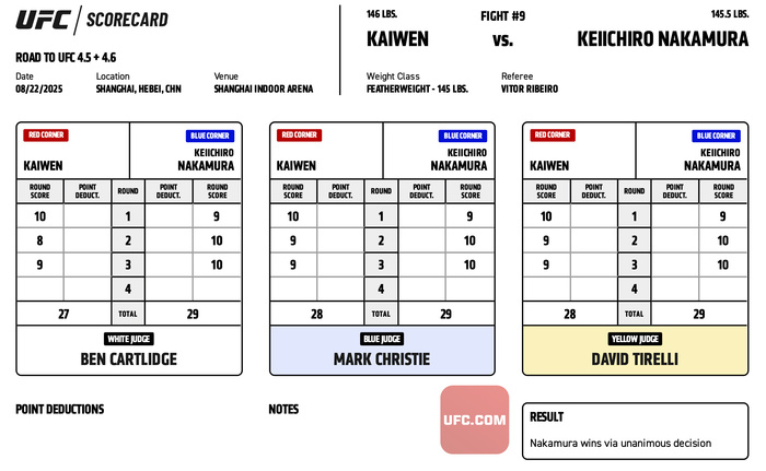 判定は3-0(29-28×2, 29-27)で中村が勝利。1Rはジャッジ3者がカイウェンを支持している。ケージの中でのインタビューでは中村倫也の通訳に、京一郎は英語で「ニーハオ、シャンハイ。最初に、彼をリスペクトしている。ありがとう。タフな試合だったけど仕掛けにいったまで。彼はタフガイ」と語ると、最後に日本語で「こういう試合を通してもっと強くなれると思う」と語った。