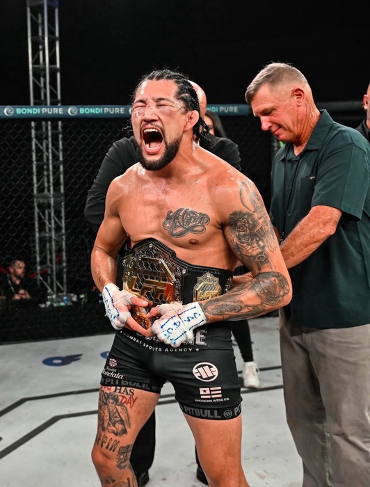 次を問われ、コーナーマンからファールカップを受け取ると、「俺はこれのために何年も戦ってきた。これが10戦目だ。タイトル防衛戦だ。2本のストライプを手に入れた」と語り、電話の代わりにファールカップを耳に当てて、「ダナ、俺を呼んでくれ、ベイビー。準備はできてる。ライト級なら誰でもいい。挑戦する準備はできてる。やろうぜ。おい、推薦状をくれ」とUFCとの契約をアピールした。