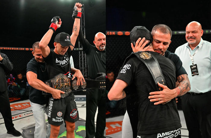 KO勝利のシャポリンに、来場しベルトのプレゼンテーターを務めたUFC世界フライ級王者のアレッシャンドレ・パントージャがハグし祝福した。
