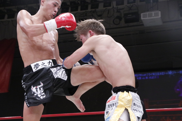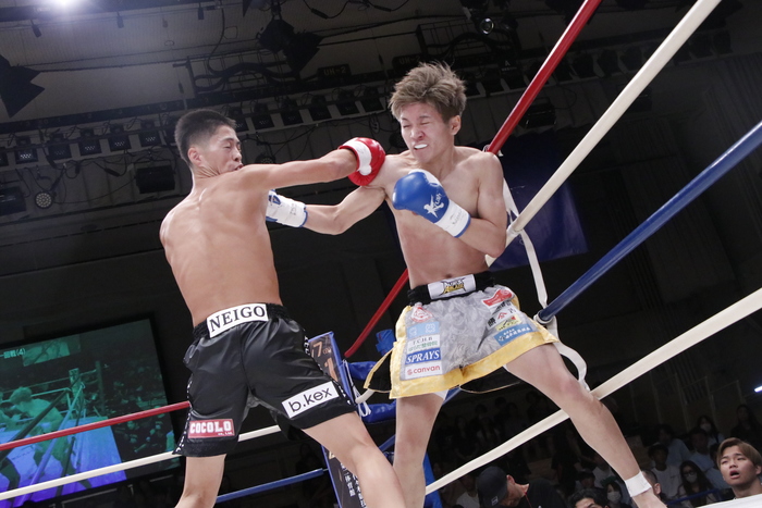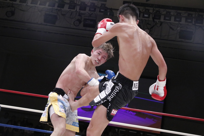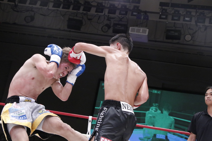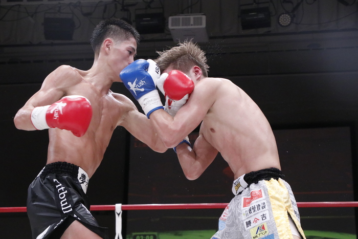 ジャブと右ローを当てていく上遠野。前へ出るのは東だが、右フックを回り込みながら当てていく。回転の効いた左右のコンビネーションを打ち込んだ上遠野は印象がいい。東もしっかり打ち返し、蹴り返して一進一退の攻防が続くが、東をかわして当てる上遠野は見栄えがいい。