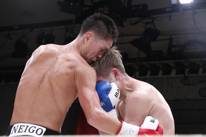 1R、両者サウスポー。東は体勢を低くして入り込み、左右フックと右ボディ。上遠野はジャブを打つが、東に入り込まれて打たれる場面がある。上遠野はジャブを打っての右三日月。左ストレートも伸ばして前へ出た。