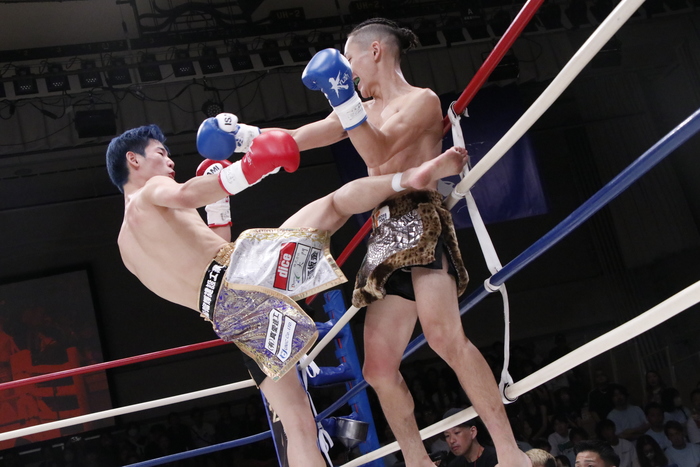 1R、サウスポーの渡部はスピードのあるトリッキーな攻撃。サイドキック、前蹴りを多用。安尾は前へ出てきて左フックから右ストレートを繰り出すが、渡部がすぐにワンツー、右フックを打つ。
