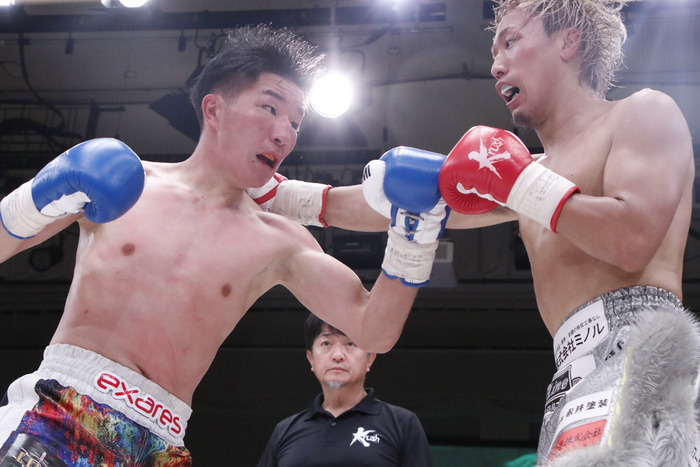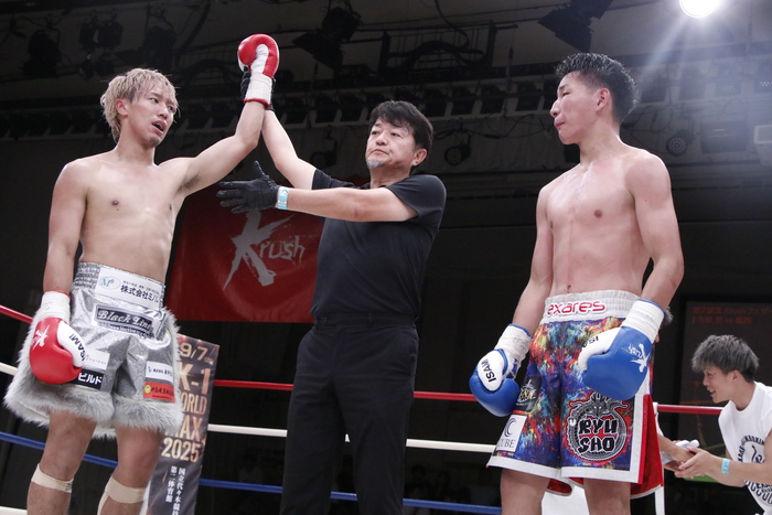 判定はドロー。延長戦へ。目に出る龍翔に小さいパンチを当てていくのは寺島。龍翔は右を打つも寺島にかわされる。最後は両者ホールディングが増えたが、細かく当てていった寺島の判定勝ちとなった。