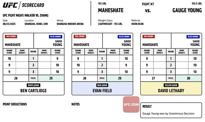#UFCShanghai Official Result: Gauge Young (30-27, 29-28, 29-28) defeats Maheshate via Unanimous Decision.
