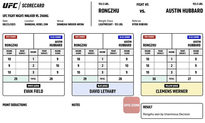#UFCShanghai Official Result: Rongzhu (30-27, 29-28, 29-28) defeats Austin Hubbard via Unanimous Decision.