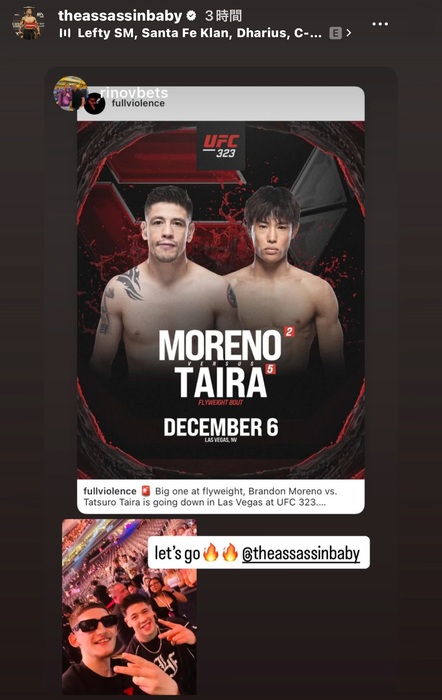 8月28日には、ブランドン・モレノがインスタグラムのストーリーに、平良達郎との試合が12月6日(日本時間7日)にラスベガスで行われる、という投稿を次々とアップ。公式では未発表ながら、自身も平良戦に前向きであることをうかがわせている。
