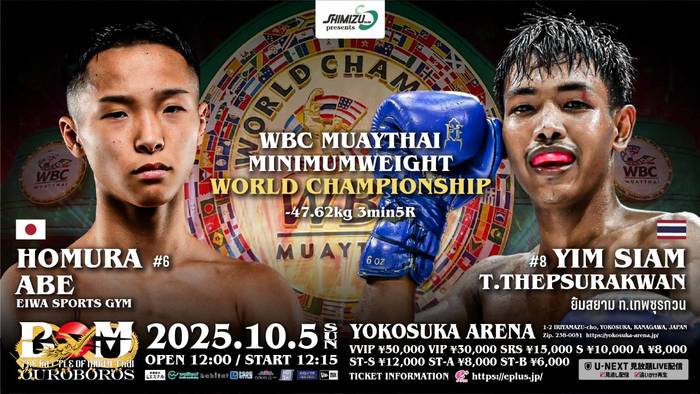 WBCムエタイ世界ミニマム級(-47.62kg)王座決定戦では、同級6位の安部焰(エイワスポーツジム)が同級8位イムサイアム・トーテープスクワン(タイ/同級8位)と激突する。安部は現在7戦7勝(3KO)無敗のエイワスポーツジムの次世代トップファイター。まだ17歳ながらもハイレベルなムエタイテクニックでRWS関係者からの評価も高い。