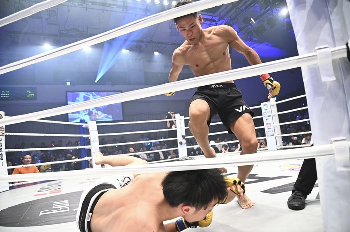 テイクダウンを奪った松本が、立ち上がってのサッカーキック。西村が立ち上がった瞬間に左フックを打ち込み、KO勝ちを飾った。