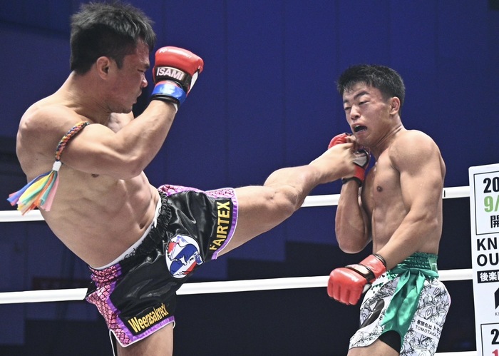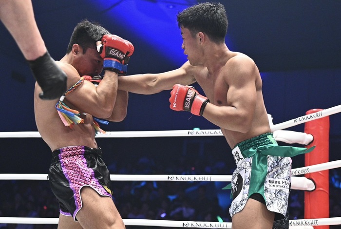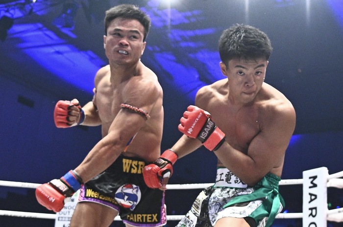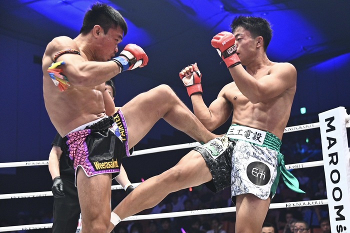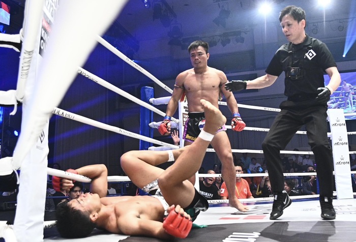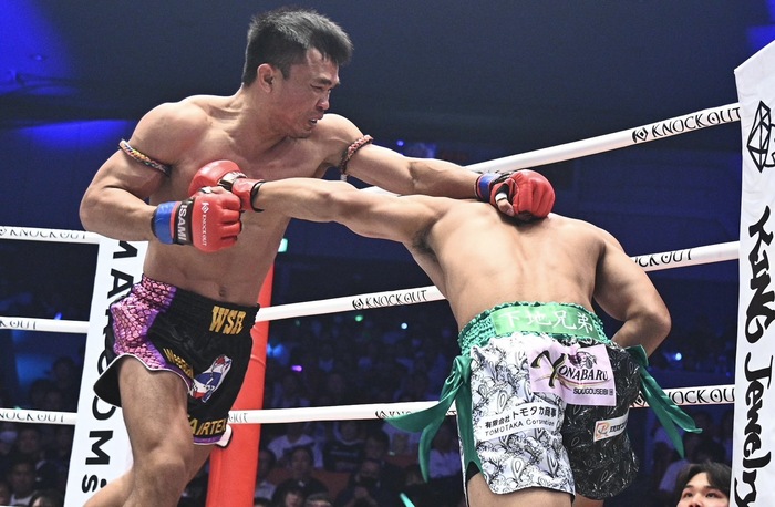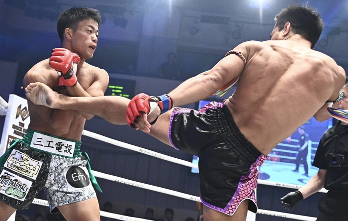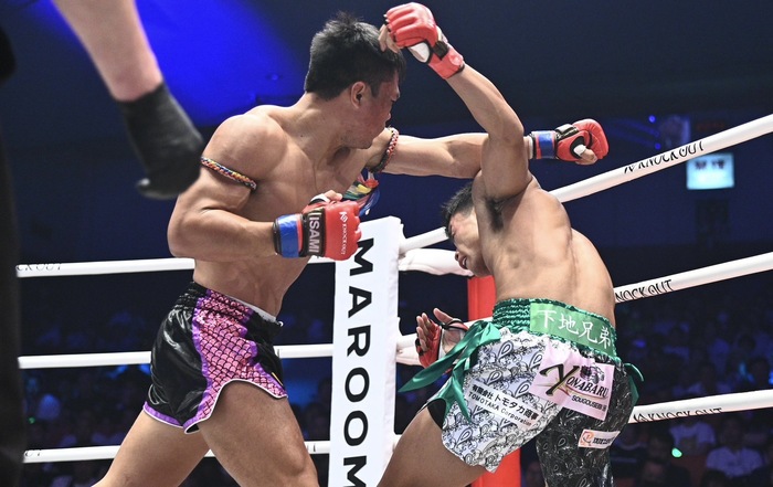 しかし、下地が首相撲に持ち込んだところでヒザの蹴り合いからゴンナパーが右ヒジを打ち抜き、ダウンを奪う。立ち上がった下地に左ミドル、左右のヒジ。下地は右ミドルとワンツーで応戦する。ゴンナパーが左ローから左ストレート、下地は右ミドルとジャブでこのラウンドをしのいだ。