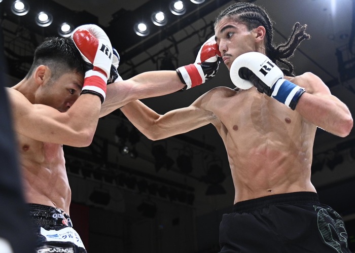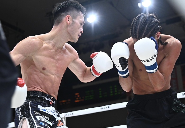 大﨑が右ボディ、左右フックと攻めるが、キャルービーも左ストレートを2発ヒットさせる。前に出るキャルービーの左をもらう大﨑。右ボディで逆襲するが、頭部へのパンチは空振りに。