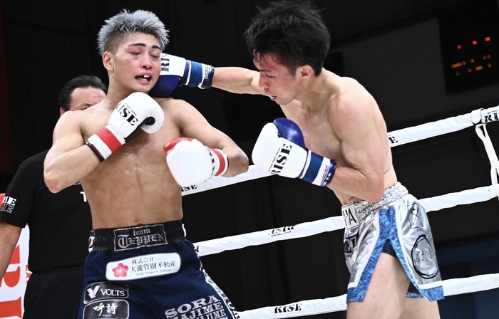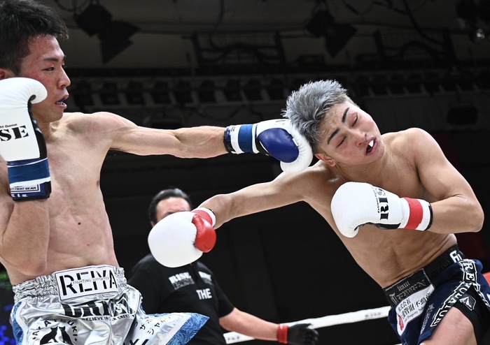 次第に追い詰められていく麗也だが右ローがクリーンヒット。それでも棚澤はパンチで前へ出ていく。左右に構えをスイッチする棚澤は右ストレート、左フックから右ハイ。