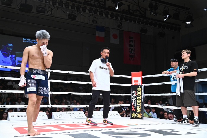 「相手いないみたいですけれど、この内容ではまだ駄目だと思いますが、僕だったら面白い試合できるし、RISEのベルト似合うと思います」と対戦相手に名乗りをあげる棚澤。