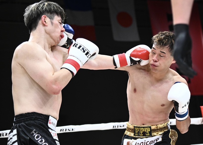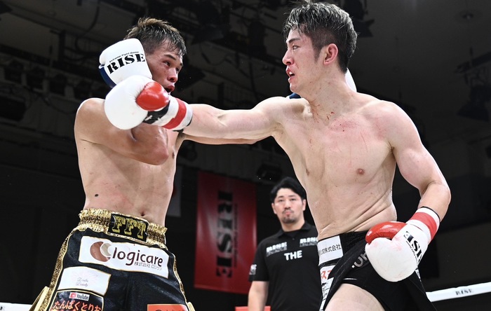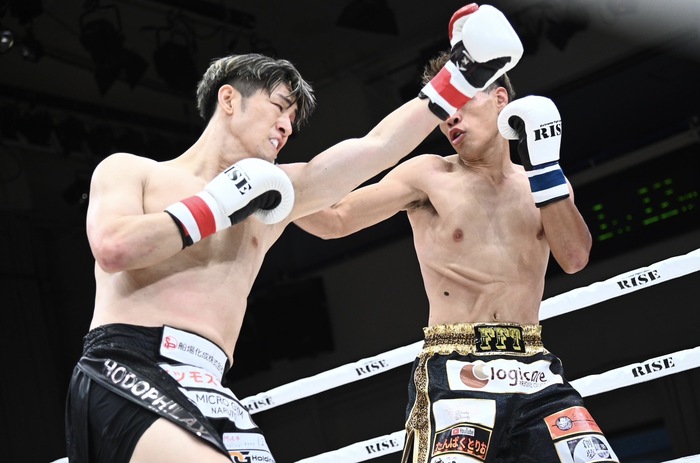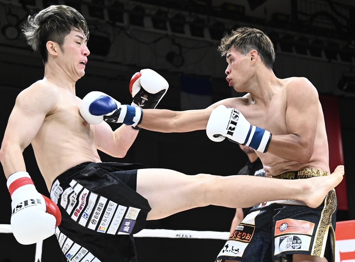 1R、稲井は右ローを蹴ってワンツー、サウスポーの和田はガードを上げて左ローを蹴っていく。稲井は強打を放つが、和田の左三日月と左インロー、ヒザをまともにもらう。稲井が右の三日月を突き刺すと、和田もすかさず左の三日月。稲田はワンツーと左右フックで前へ出て圧をかけていく。