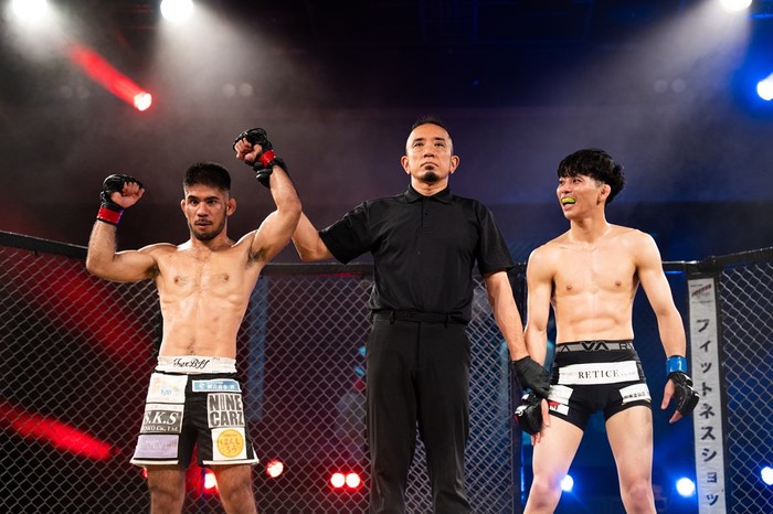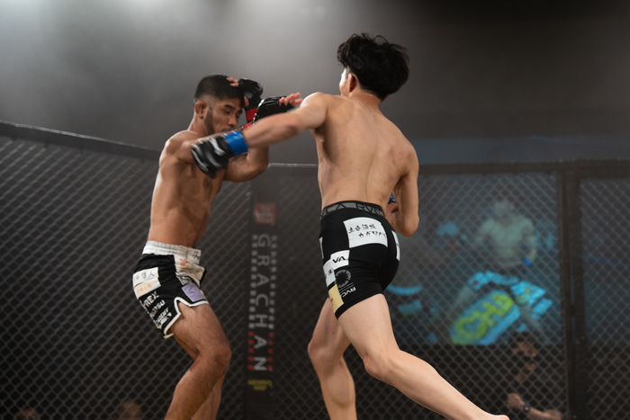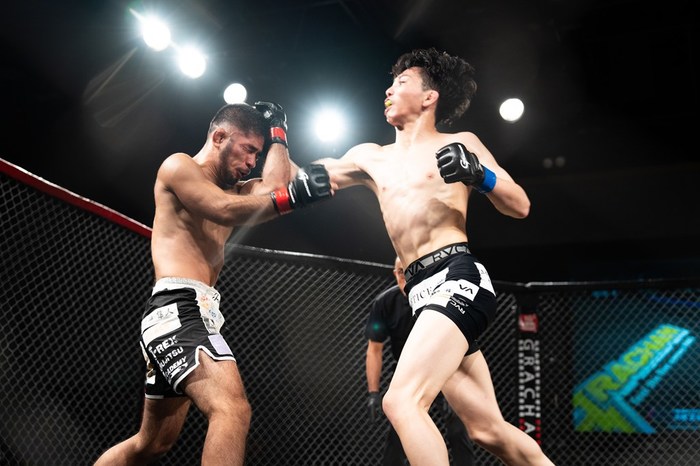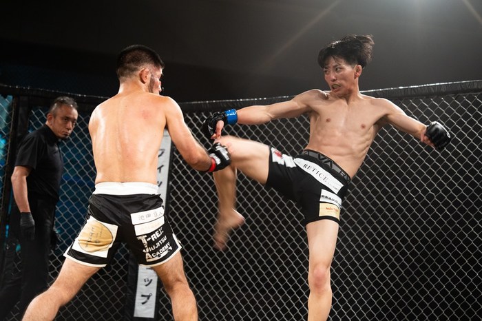 1R、ワンツーから右で差して刺押し込む三笠に、大城は左小手でケージ背に。押し戻した大城はサウスポー構えから左を突いて前進。