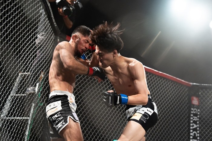 2R、右ミドルハイをガード上に突く三笠に、大城は左オーバーハンドから組み。右で差して体を入れ替える三笠。ブレーク。三笠の右アッパーに左ストレートを当てた大城がさらに左を突いてシングルレッグへ。