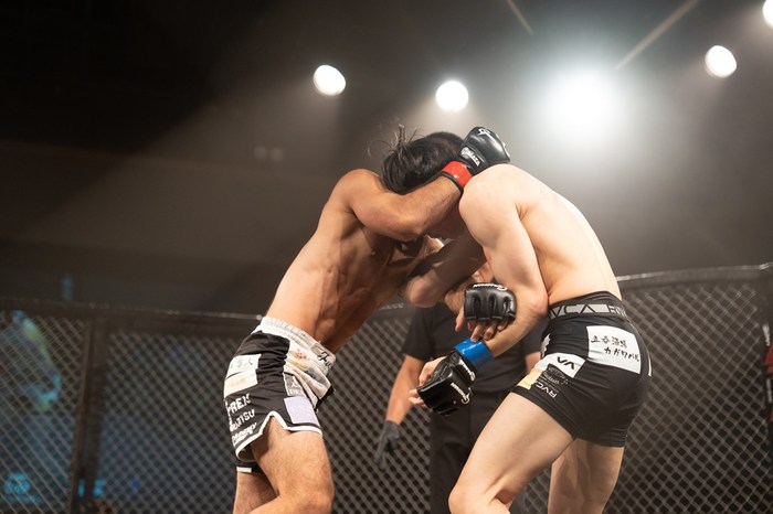 右小手で差し上げる三笠が体を入れ替え。しかし押し込む大城がテイクダウン! すぐに立つ三笠が左右。大城も打ち合いつつ組みに。シングルレッグに。そこにヒジを突く三笠だが、大城が両差しでホーン。