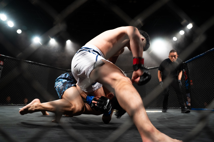 2R、すぐにシングルレッグの森渕。ケージ背に四つの中島に左をかち上げ崩してシングルレッグに移行の森渕。そこにアッパーを突く中島だが、森渕はドライブして尻を着かせる。立つ中島の送り手を掴んで再び崩してパス狙い。