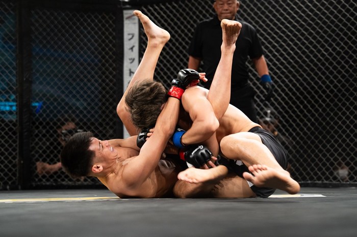 松本の三角絞め狙いをかつぎパスでサイドに。左枕からマウントに。パウンドに背中を向けた松本にリアネイキドチョーク。身体を伸ばすが、松本もケージを蹴ってヒザを曲げて凌ぐ。判定3-0で福田が勝利。
