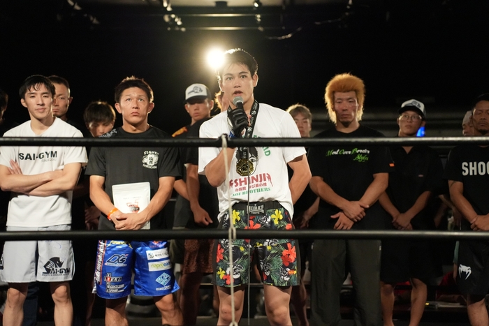 ベストバウト賞を獲得した青井は試合後、「こんにちは。心技舘の青井心二です。新潟大会に2回呼んでいただき、風田(陣)さん、本当にありがとうございます。2年前は前座で、もう本当最初の方の試合だったんですけど、2年でメインイベントになって、少し成長した姿を見せられたかなと思います。今すごい本当得られるものがあって、どんどん強くなってる自信があって、もうこういう新潟とか他の地方の大会も出させてもらってるんですけど、地方からでもこういう強い選手が出るんだぞっていうのを見せたいので、今年このまま修斗の世界ランク入って、来年ベルト獲りに行きます」と力強く語った。