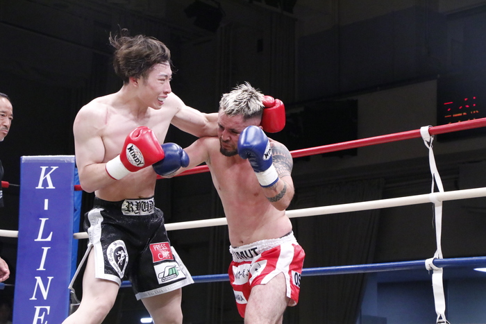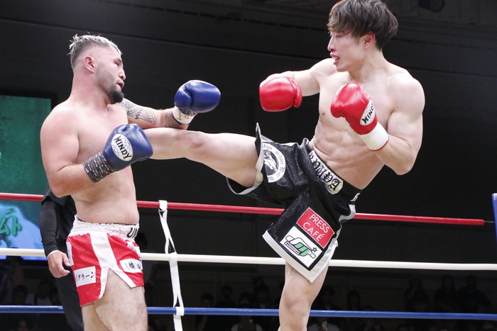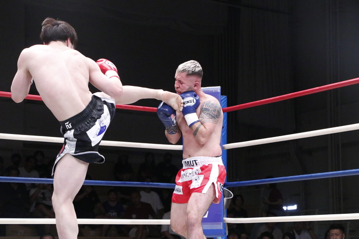 2R、右カーフと左右フックのウムトに藤平はワンツーで応戦。互いにパンチで押し合う展開が続く中、藤平が離れ際に右ハイをヒットさせてダウンを奪う。その後もハイを狙う藤平にウムトはフックとボディ。