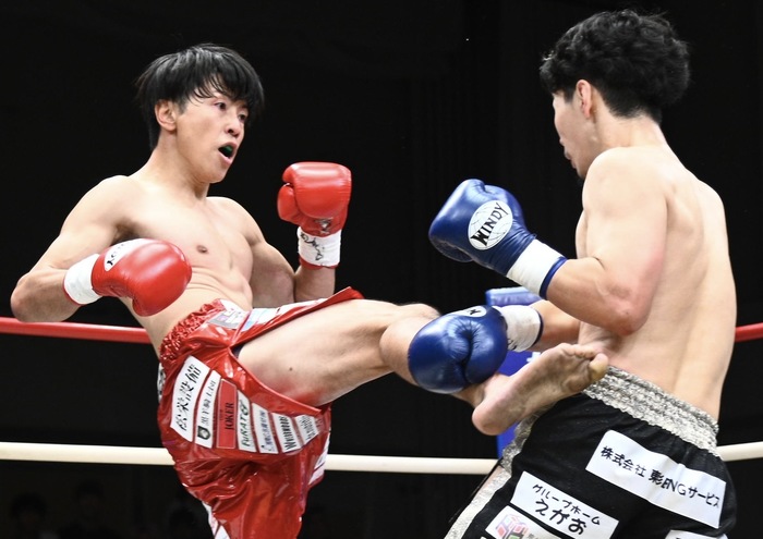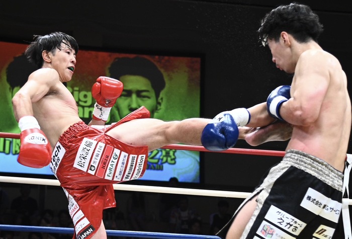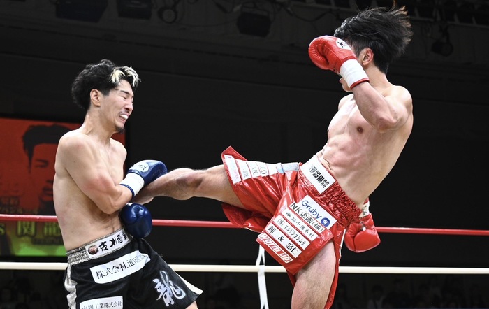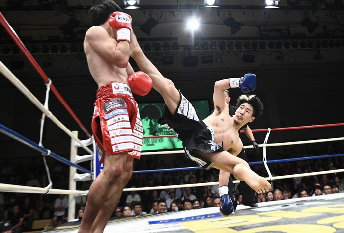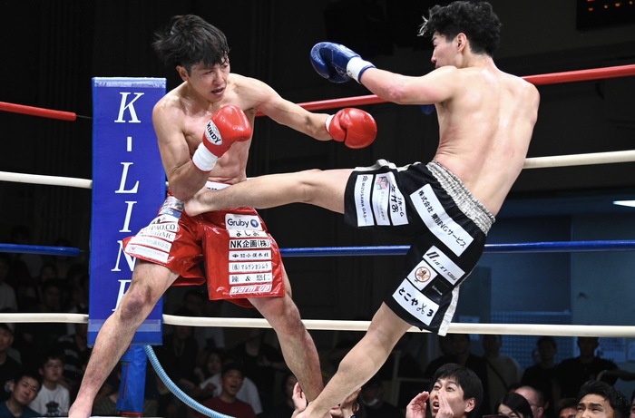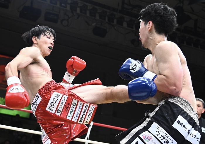 2R、関の左右ミドルに山際も右ミドルで応戦。ジャブで前に出る山際に関が左フック、すぐに前へ出る関だが山際は右ミドルで体勢を整える。山際の右ミドルに右カーフを合わせる関、山際がバランスを崩す。山際は右ミドルを蹴っていき、関の左インローにも右ミドルを返す。その右ミドルから右フック。左ミドルも蹴る山際に関は右カーフ、山際が右ミドルを返す。