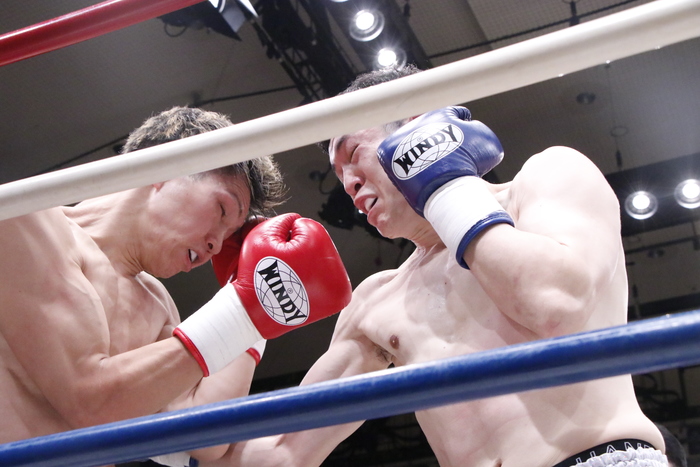 2Rも田中は右カーフ、左インロー、左三日月、ハイキックと多彩な蹴り技を上中下に振り分ける。蘭丸は蹴りをもらいながらも前へ出てワンツーを打って行き、ロープを背負う田中に左ボディ。