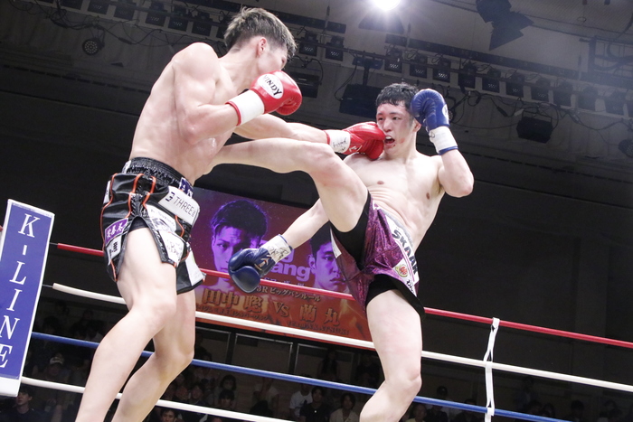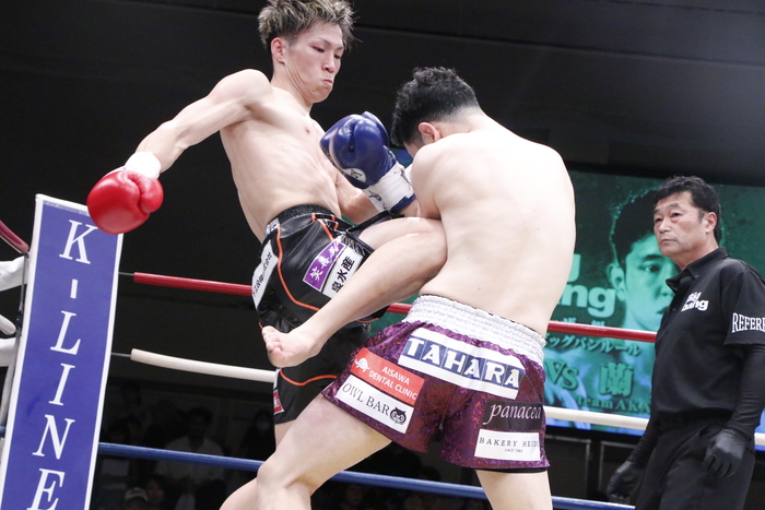 1R、蘭丸がラッシュをかけて左右連打で田中をコーナーへ追い込む場面もあったが、田中がカーフ、インロー、ヒザ、三日月と多彩な蹴り技を振り分けていく。