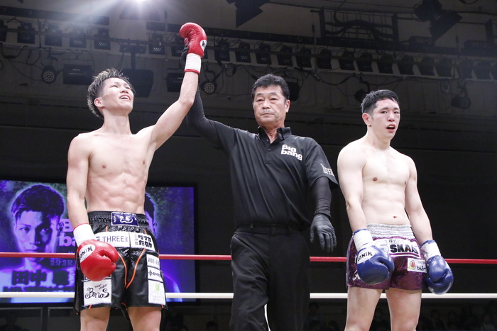 3R、蘭丸はワンツーを出して前へ出続け、手数も多く出すが、田中は蹴り技を駆使して譲らない。前蹴りでアゴの蹴り上げも。さらに田中は相手の首に腕を引っかけてや前足払いなどの崩しも使う。当てて回り込み蘭丸に追い詰めさせず、判定勝利を飾った。